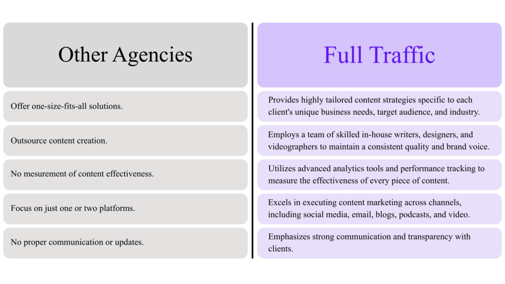 Full Traffic B2B content marketing agency uses a strategic blend of technology and creativity to deliver results. We help businesses boost their online presence, generate traffic, and create content that resonates with other businesses. Our process is driven by measurable outcomes that ensure your business achieves its marketing objectives.
