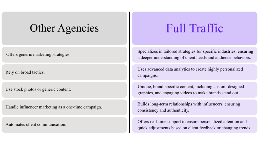 An Instagram marketing agency like Full Traffic specializes in using Instagram to help businesses grow their brand presence, increase engagement, and drive traffic through strategic content creation, influencer marketing, and paid advertisements.