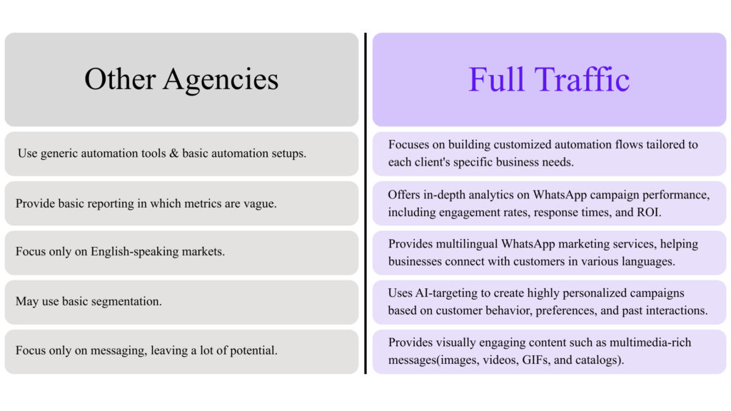 Our WhatsApp marketing agency stands out because of our proven track record of helping businesses achieve explosive growth through data-driven marketing strategies. We offer personalized service, expert optimization, and a results-oriented approach. Our team is committed to helping you maximize your return on investment and drive long-term success.